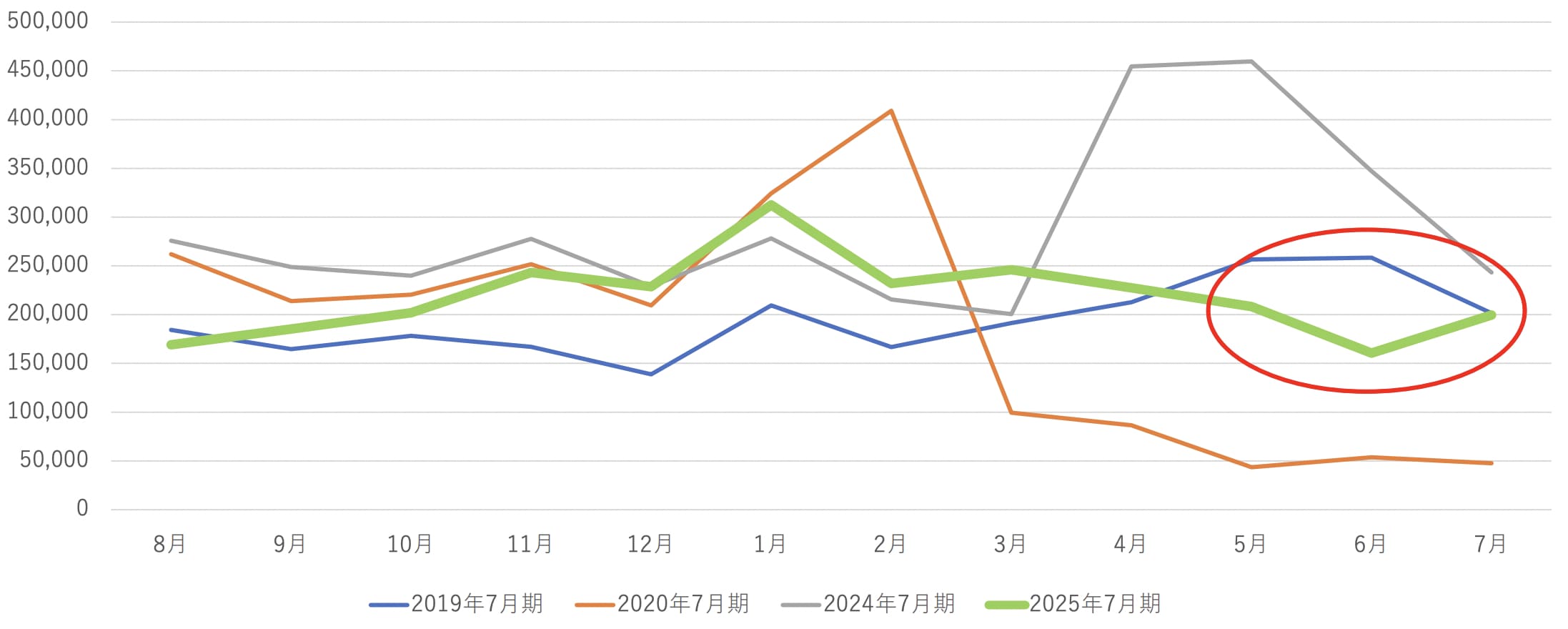 当期実績及び前期実績の比較2023年7月期比で取扱高が233.2%、売上高が235.6%と大幅に増加しました。これは、期首から期末までの1年を通してクルーズが正常に運航していたことに加え、2023年8月に共同チャータークルーズを2コース、2024年6月に単独チャータークルーズを2コース催行したことによります。一方、取扱高総利益率が25.0%から23.0%に低下しておりますが、8月のチャータークルーズや上期の買取キャビンにおいて、一部販売に苦戦したことによるものです。ただし、今後の更なる成長には、チャータークルーズ等の在庫リスクをとっていく必要があると考えており、今後も積極的に、チャータークルーズやキャビン買取を行っていく方針としております。